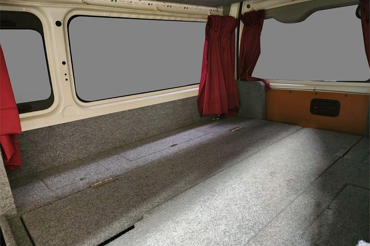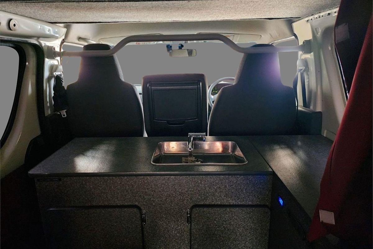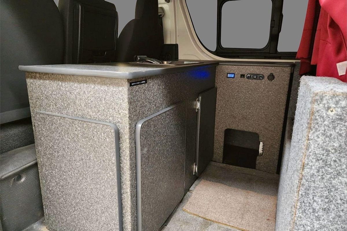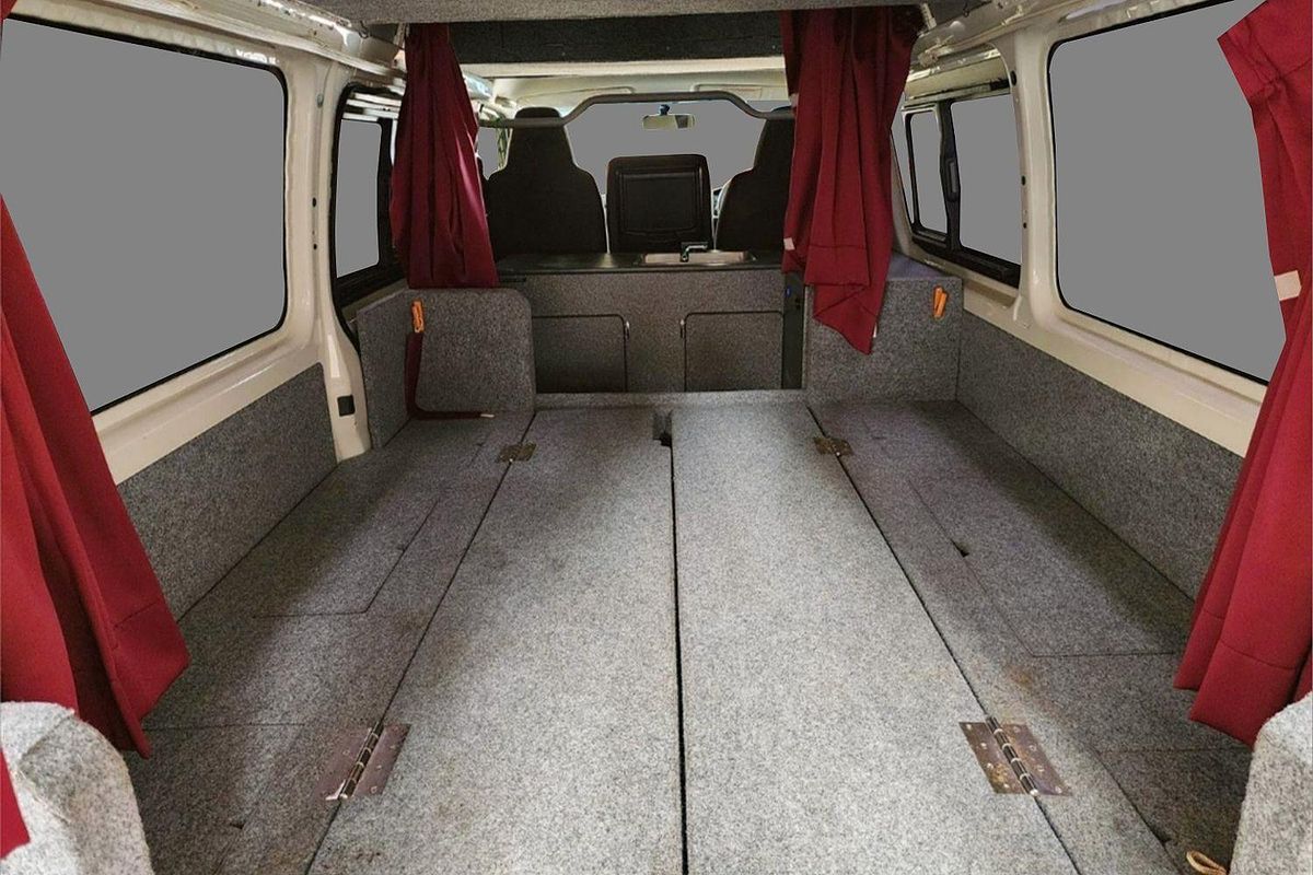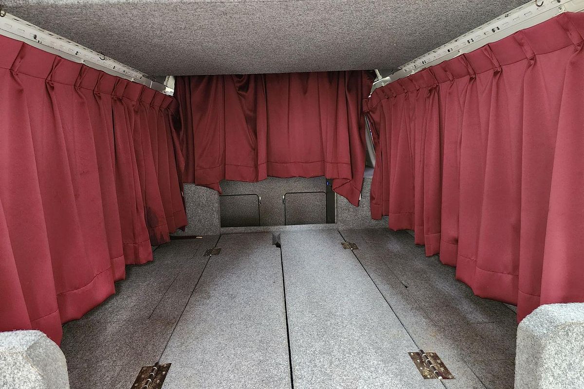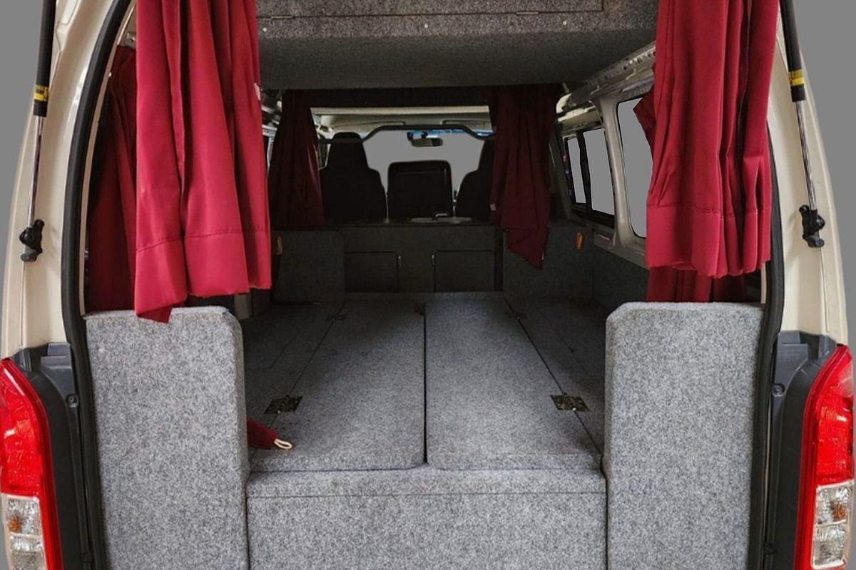 Inside, the built-in camper fit-out includes foldable bedding with storage, fitted carpeting, and privacy curtains, making it ready for immediate use. Finished in a clean white exterior with a durable grey interior, this Hiace also features air conditioning, airbags, Apple CarPlay/Android Auto, reversing camera, and automatic high-beam for modern driving convenience.