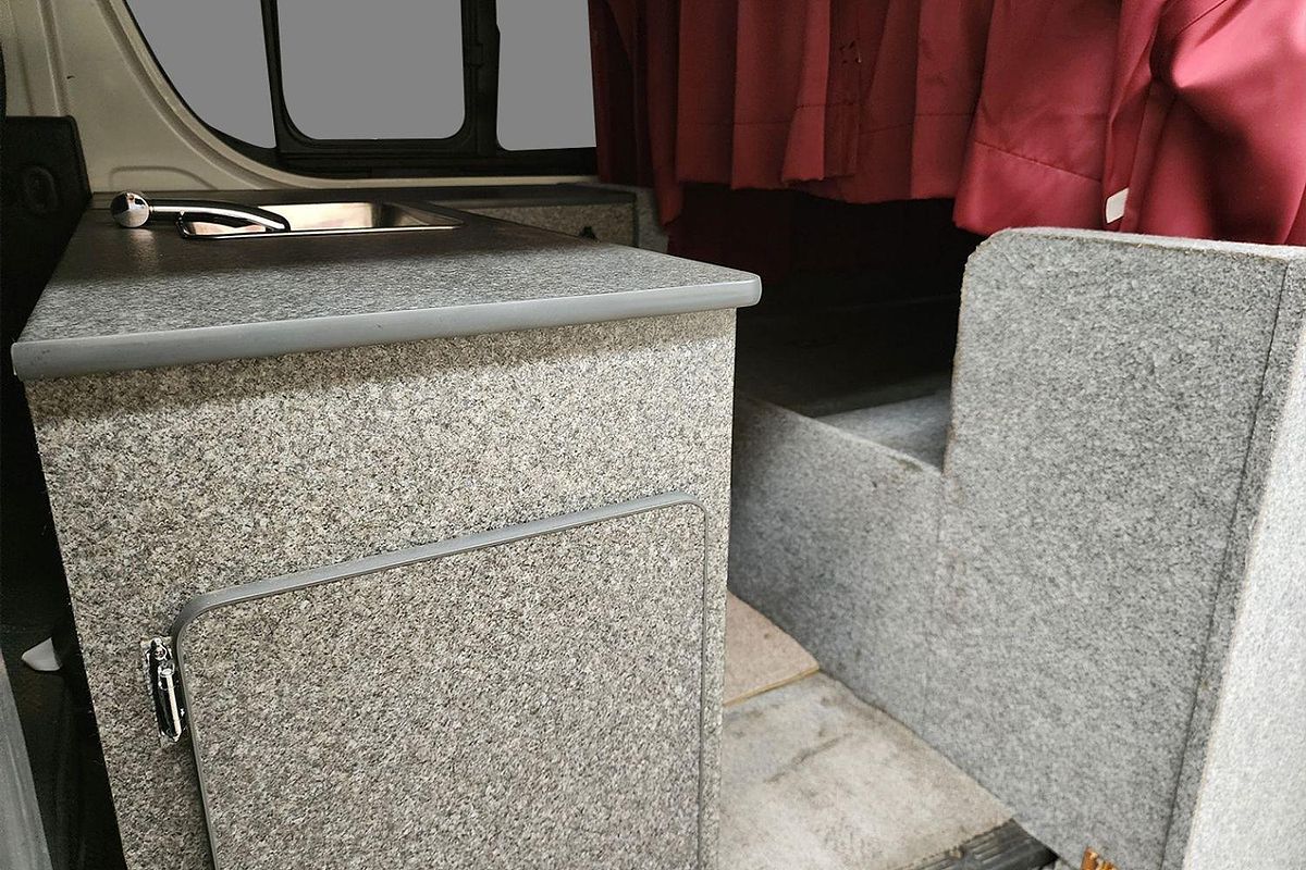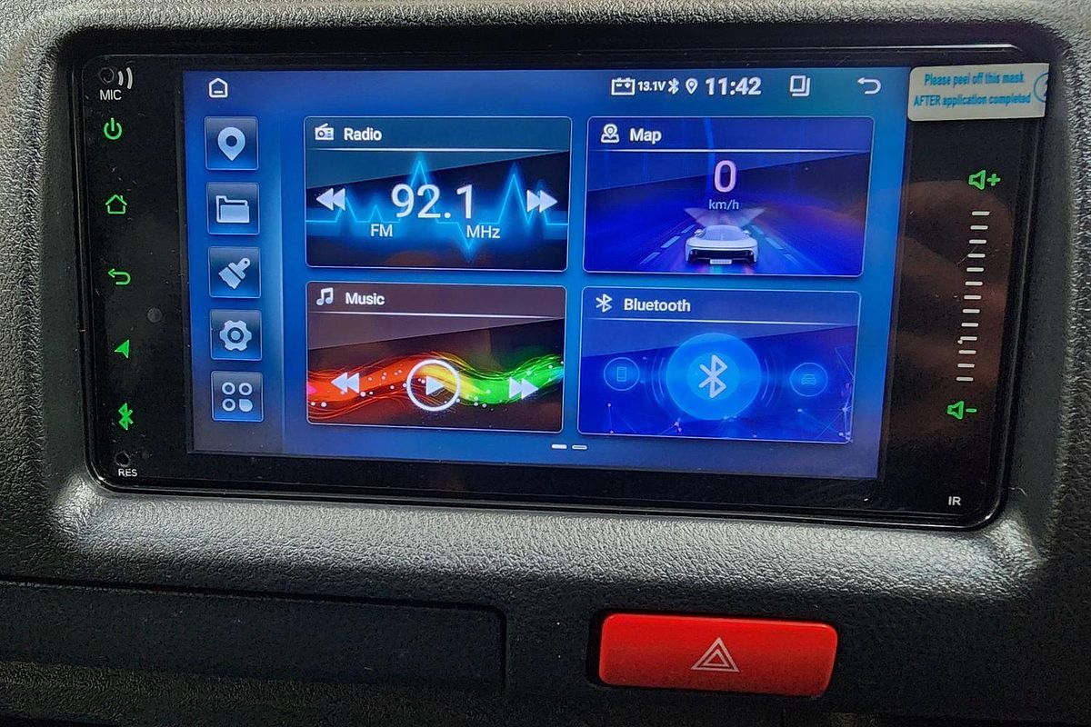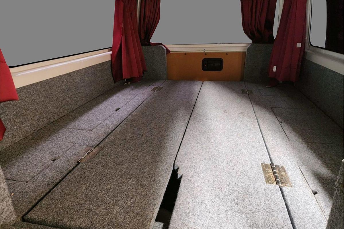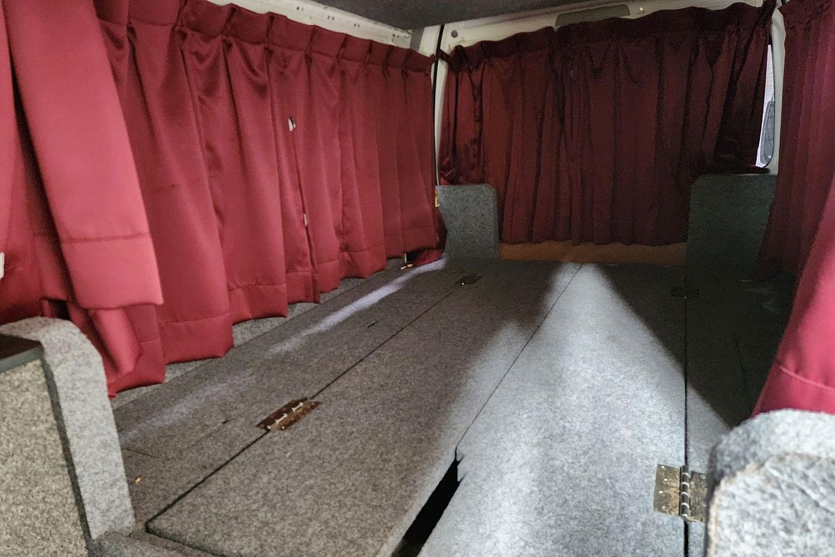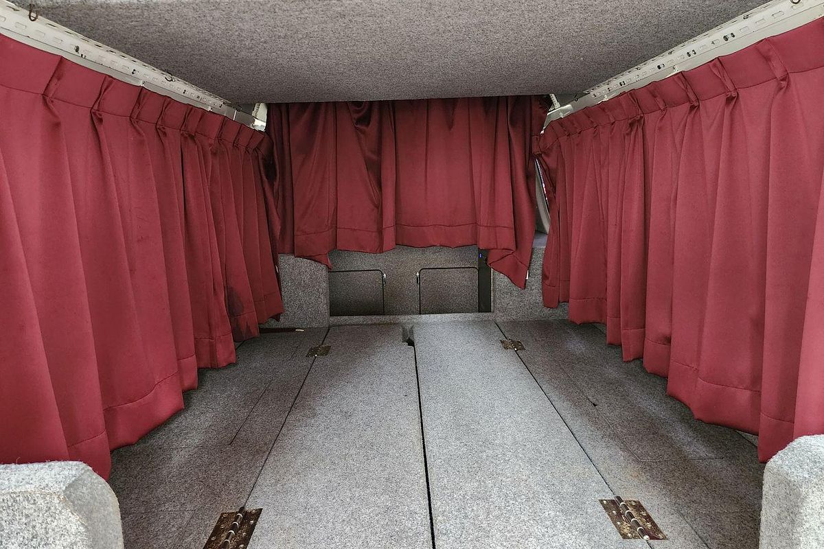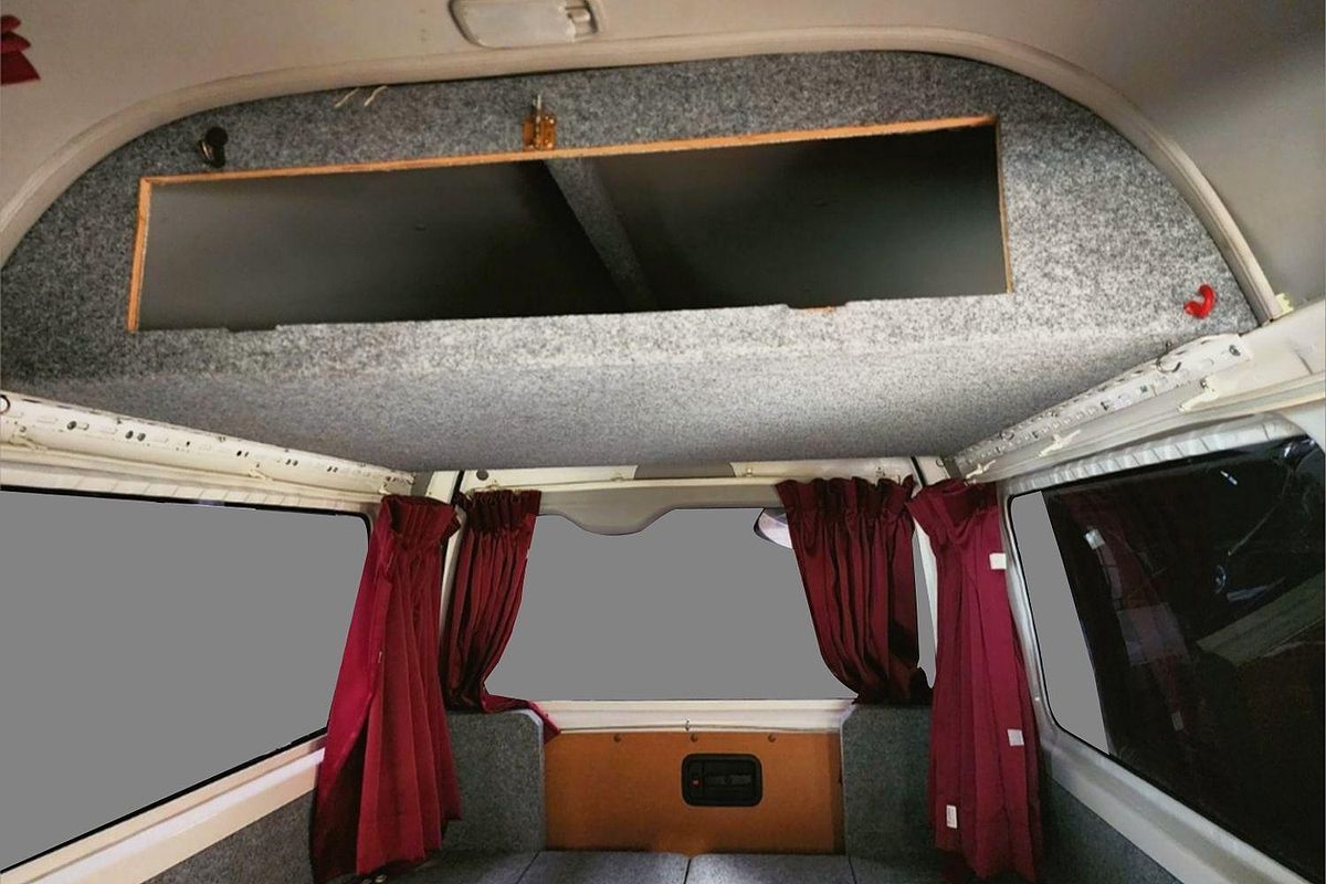 Inside, the built-in camper fit-out includes foldable bedding with storage, fitted carpeting, and privacy curtains, making it ready for immediate use. Finished in a clean white exterior with a durable grey interior, this Hiace also features air conditioning, airbags, Apple CarPlay/Android Auto, reversing camera, and automatic high-beam for modern driving convenience.