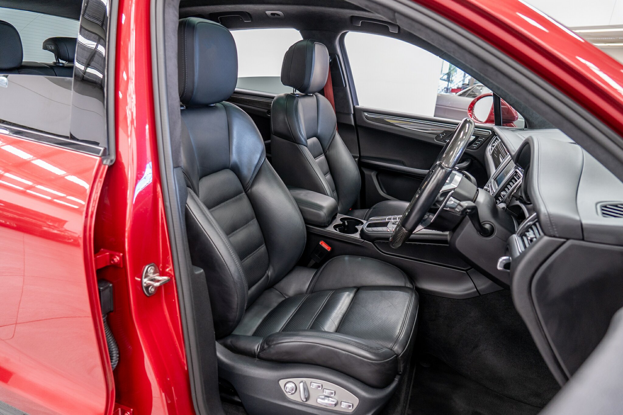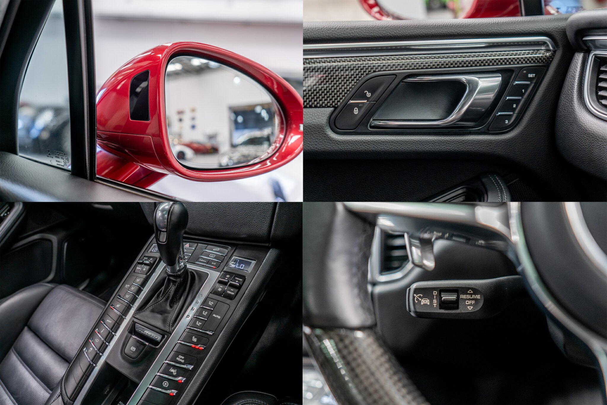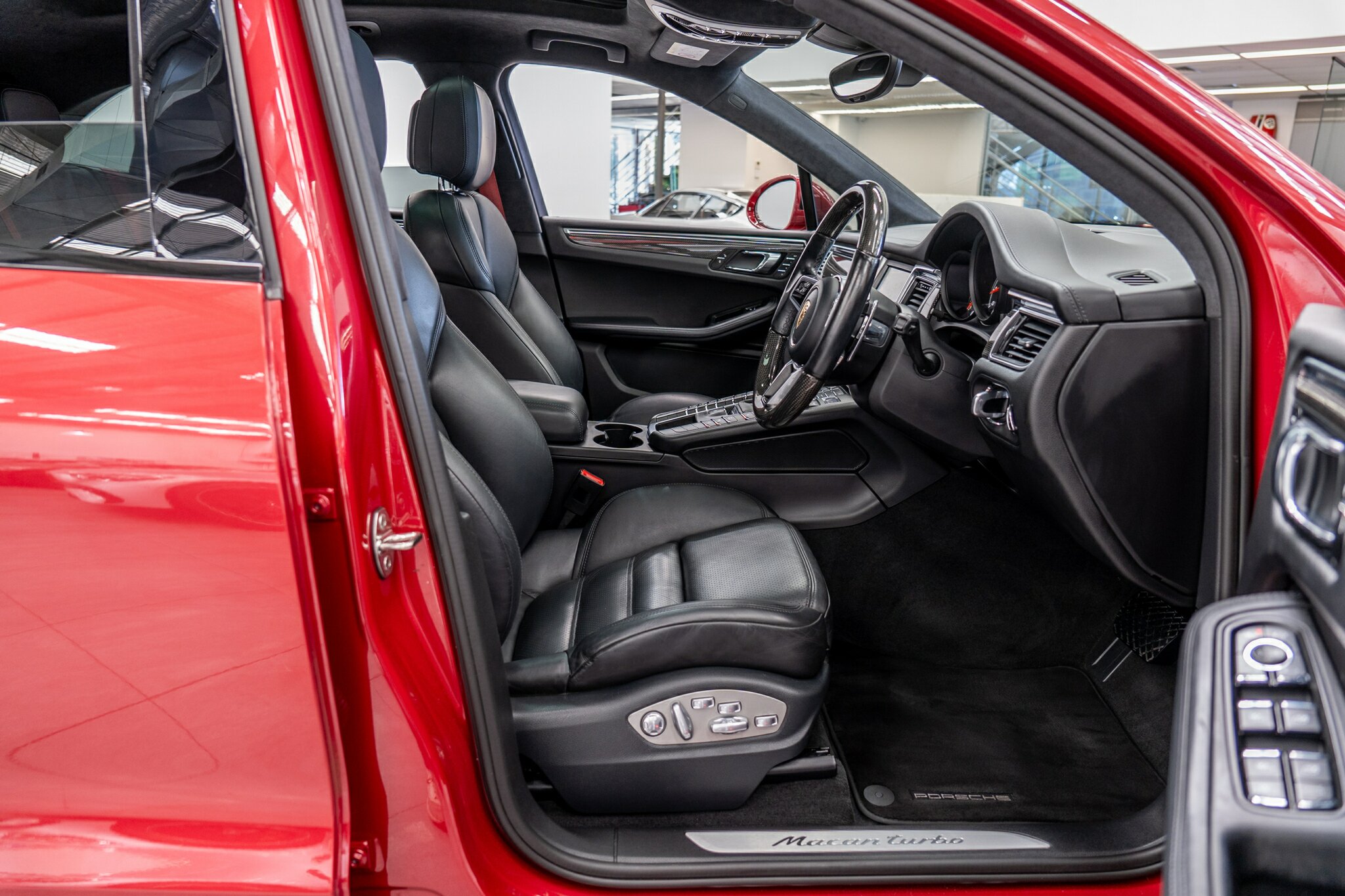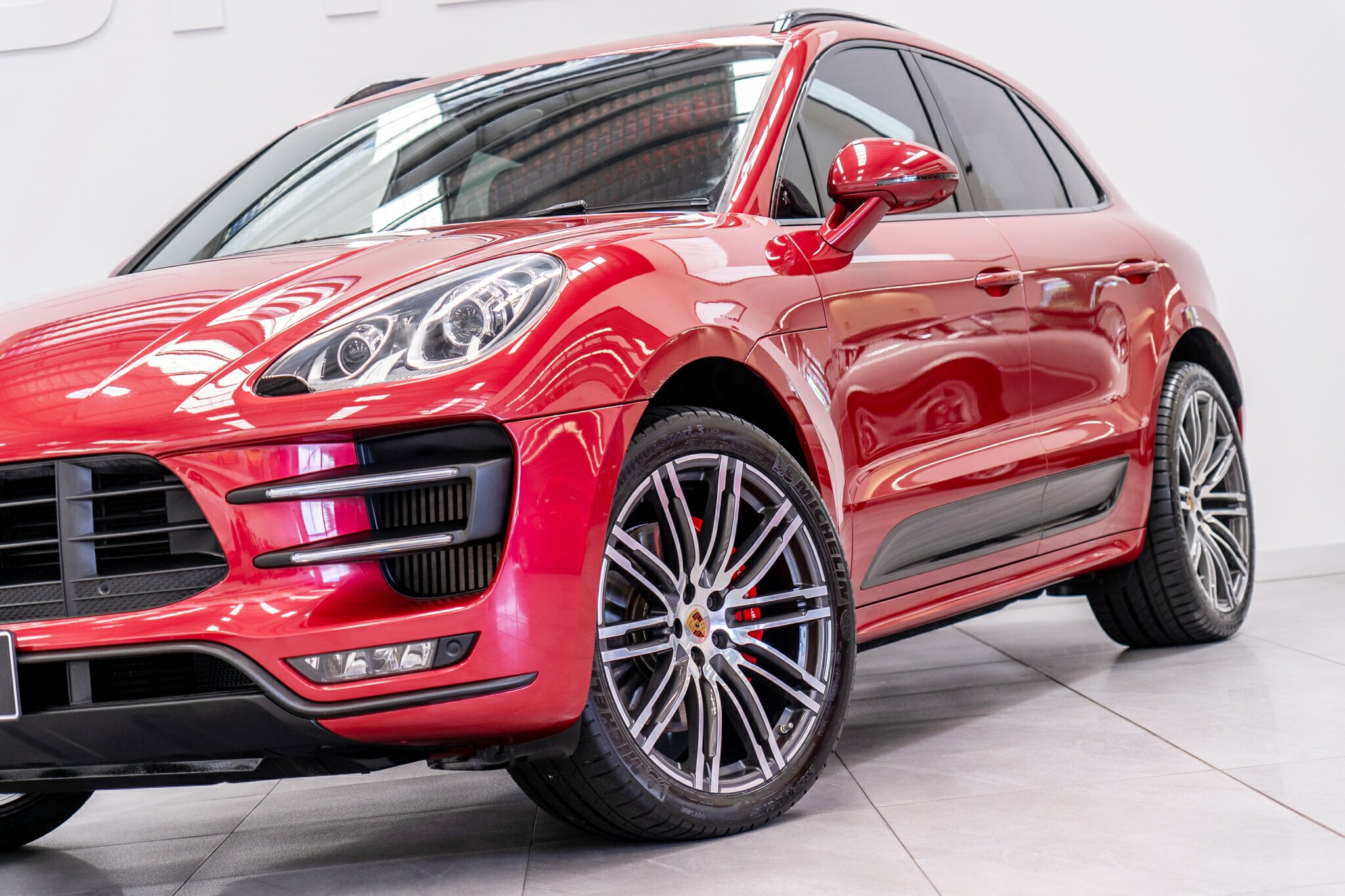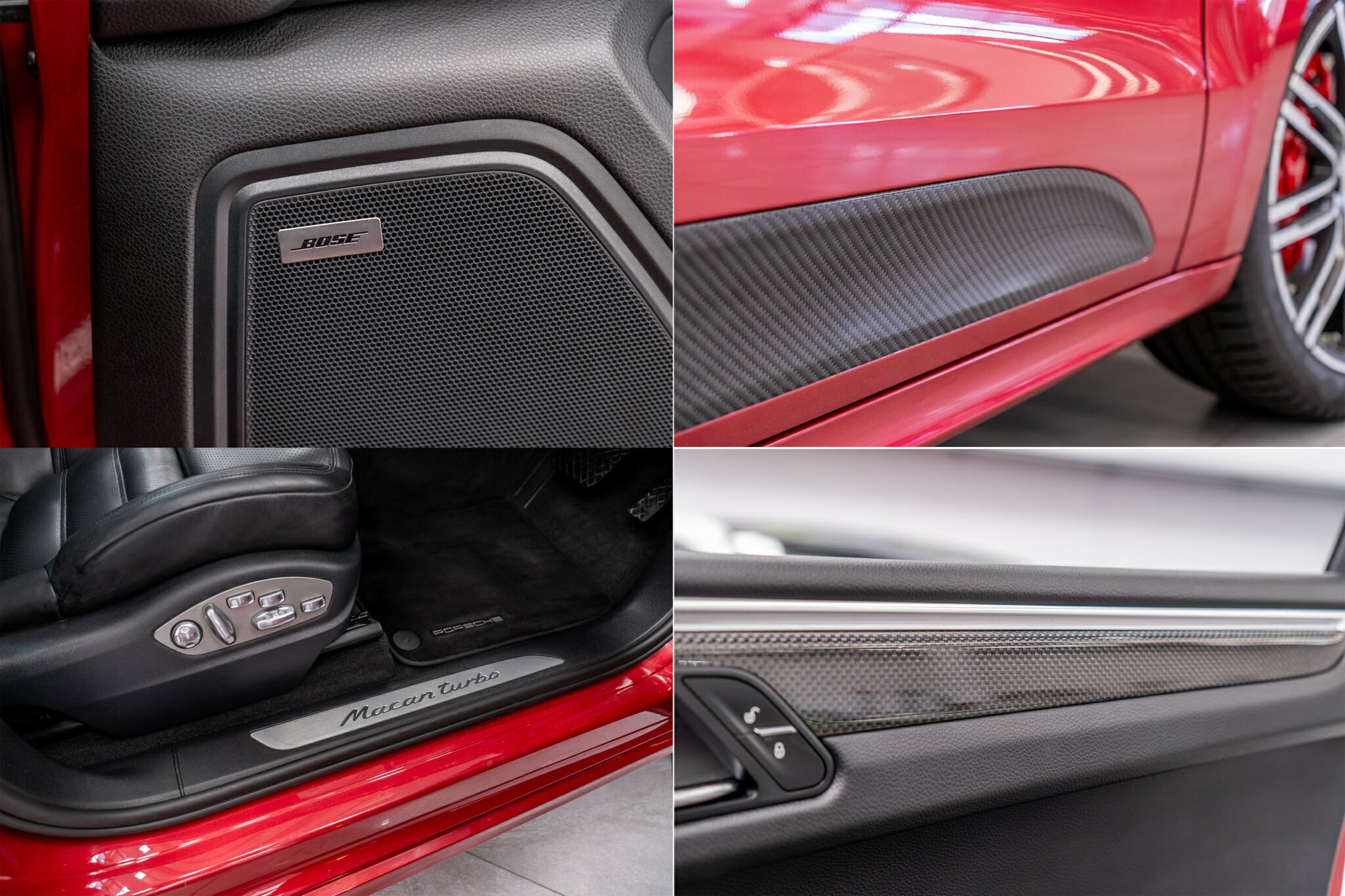 Porsche Macan TURBO 2015 (3.6L Twin-Turbo V6) MOST highly optioned with the most sought after Porsche exlcusive options, Panoramic glass sunroof, full carbon fibre interior package, exterior side blade in carbon fibre and Monochrome black exterior package. Finished in the most stunning bespoke rare special order Impulse Red metallic with full soft touch ash black leather interior package with extended leather package ( leather dash and door cards ), double stitching throughout, carbon fibre interior trim finishes, Garnet Red seat belts and much more.