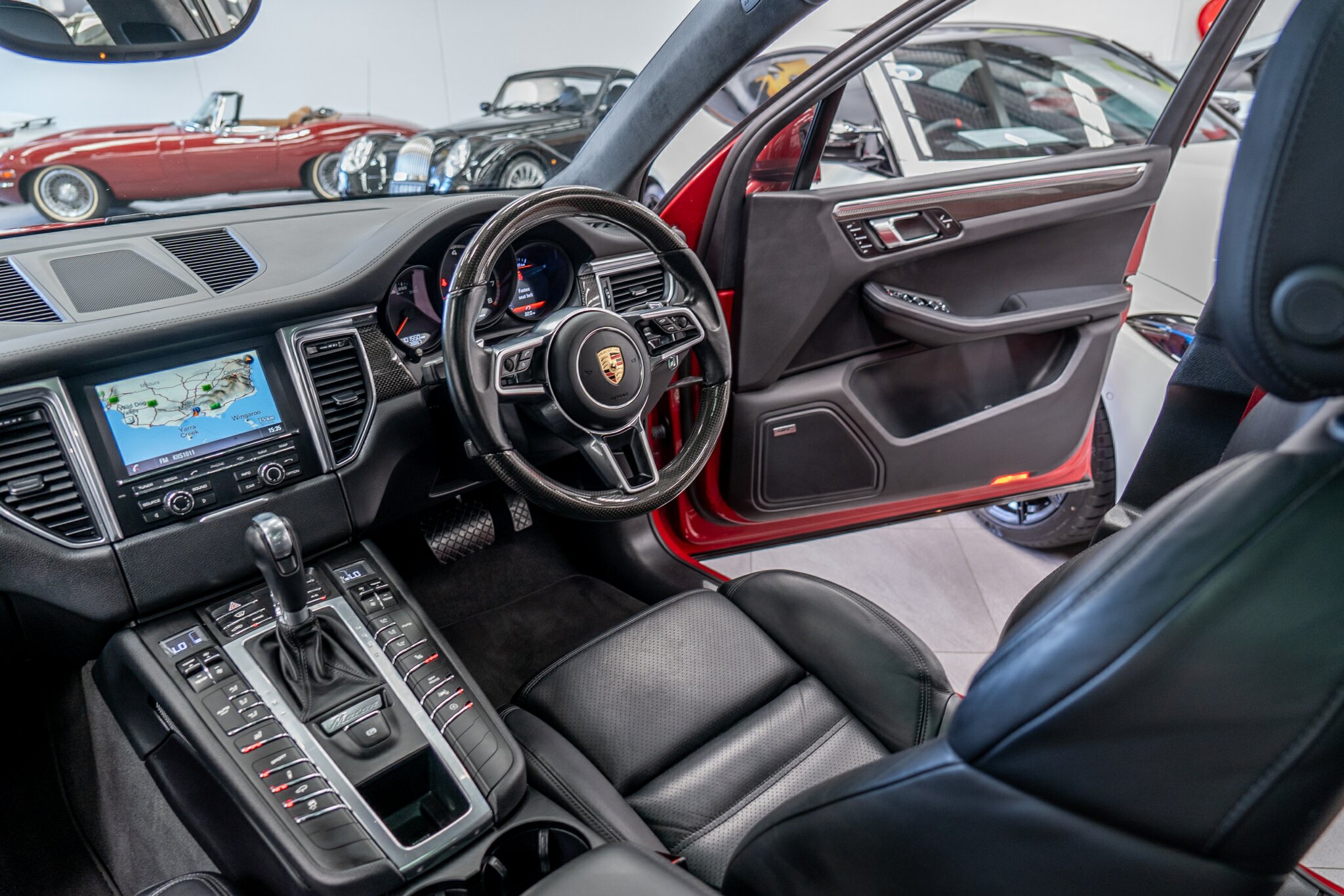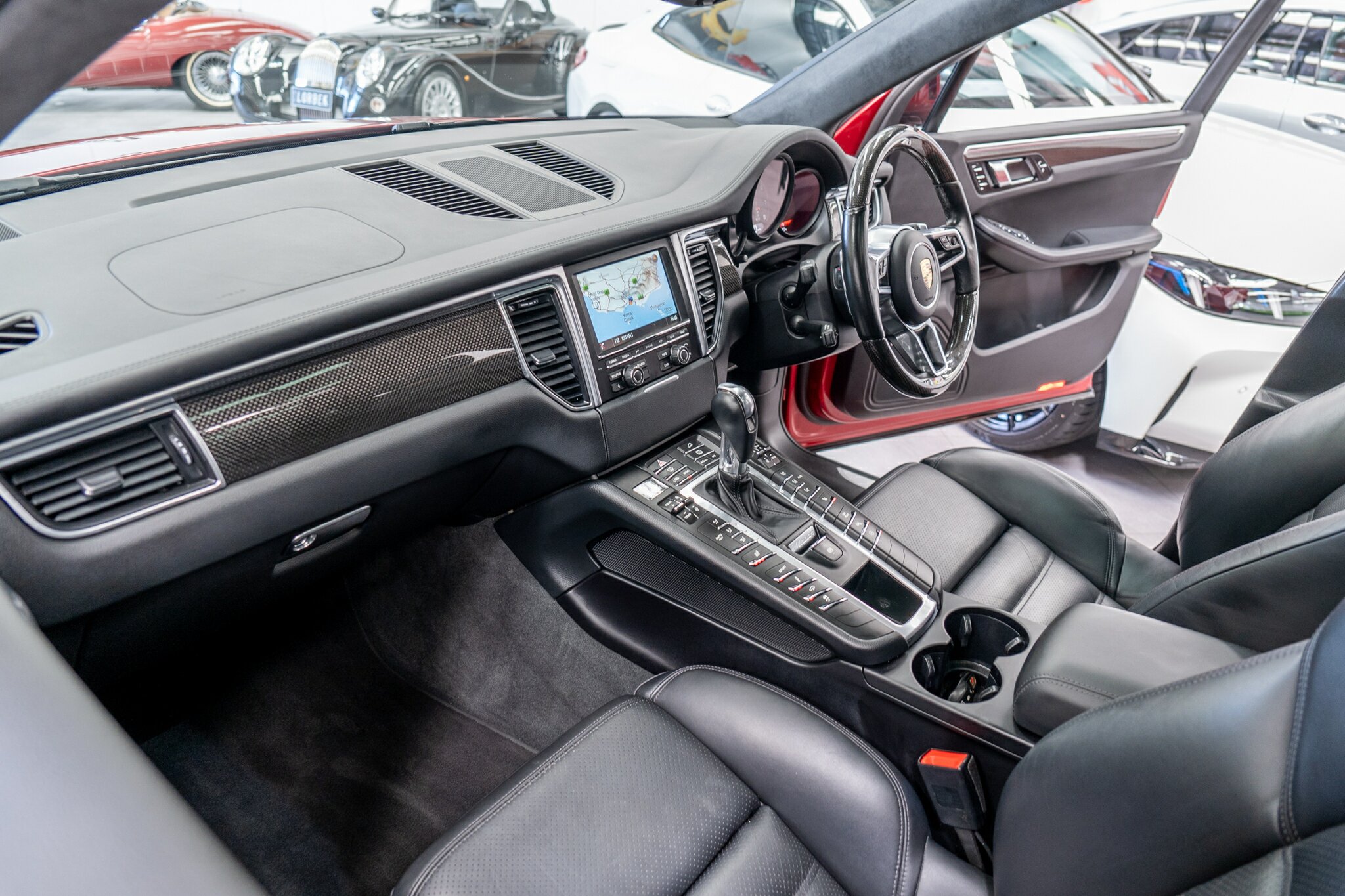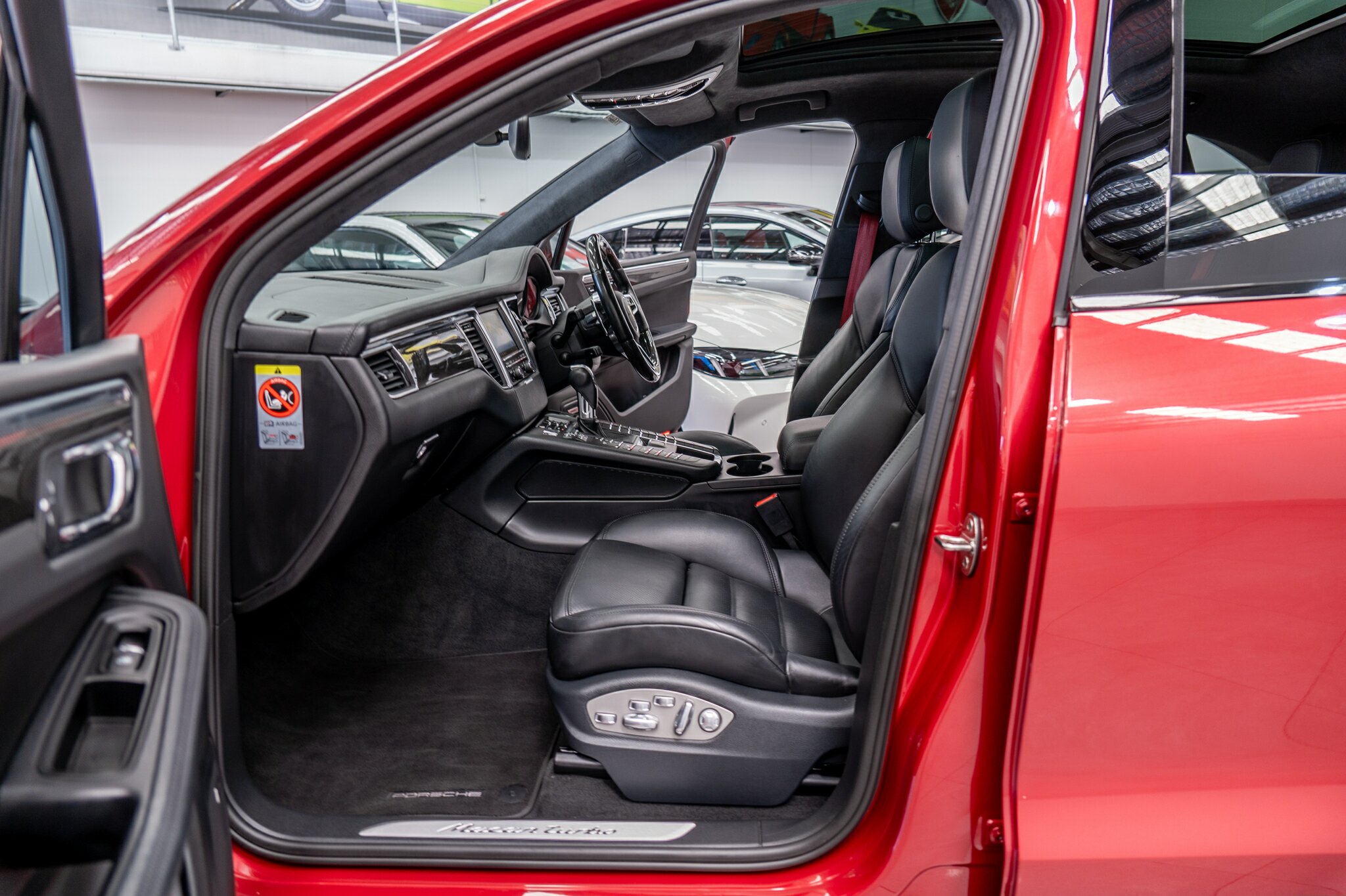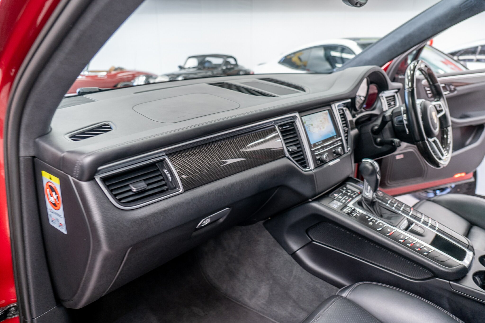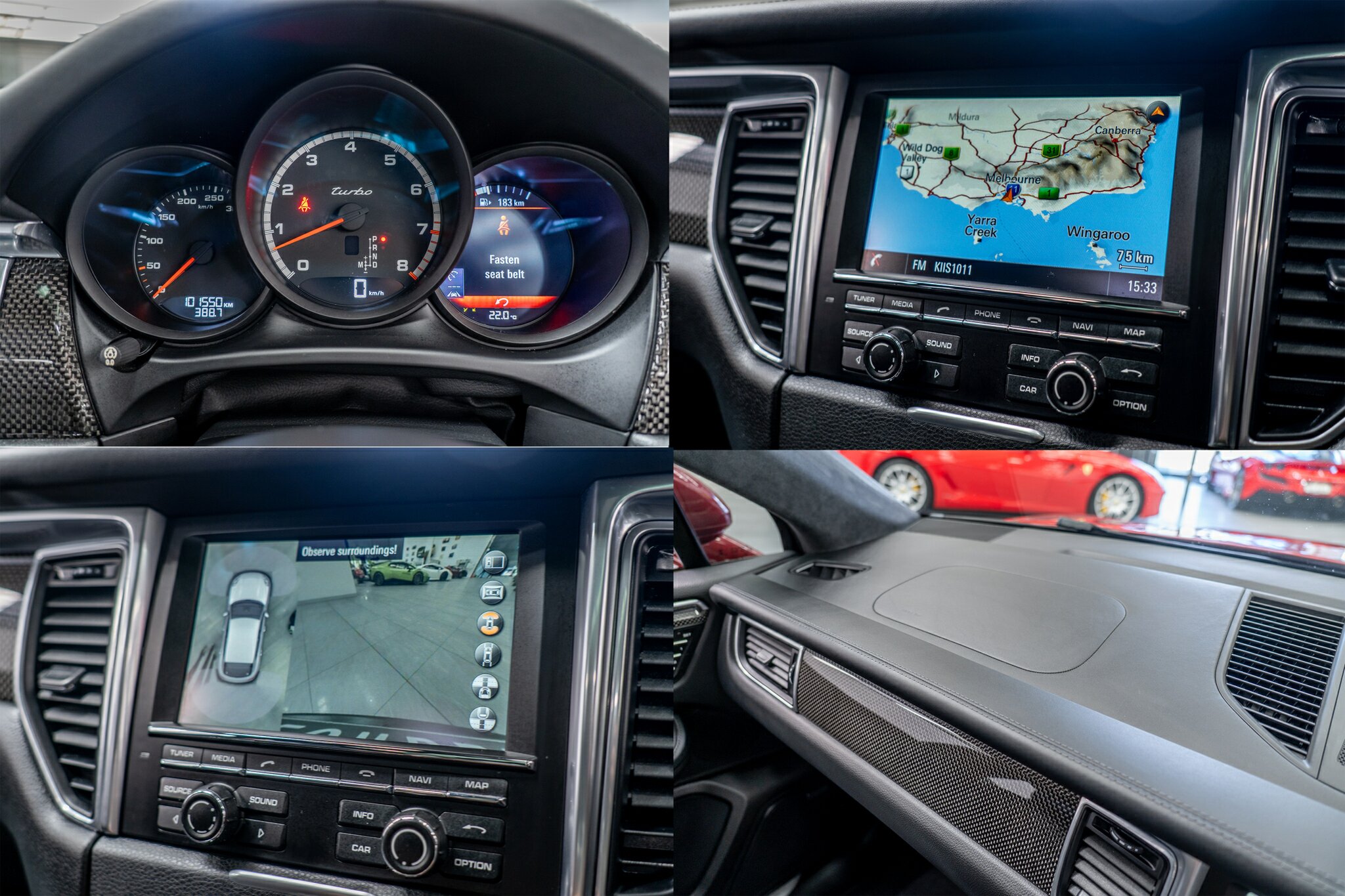 Porsche Macan TURBO 2015 (3.6L Twin-Turbo V6) MOST highly optioned with the most sought after Porsche exlcusive options, Panoramic glass sunroof, full carbon fibre interior package, exterior side blade in carbon fibre and Monochrome black exterior package. Finished in the most stunning bespoke rare special order Impulse Red metallic with full soft touch ash black leather interior package with extended leather package ( leather dash and door cards ), double stitching throughout, carbon fibre interior trim finishes, Garnet Red seat belts and much more.